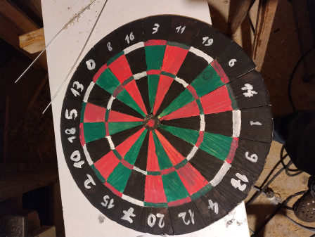 L’idée de départ était de faire un jeu de fléchettes en bois. Chaque secteur devait être un morceau de bois distinct, avec une finition cire mate une fois sur deux, histoire de jouer sur les couleurs. Dans ma tête, ça faisait un truc classe.